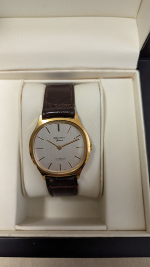 Gents watch by Delvina Geneve, 17 jewel manual wind movement on dark brown leather strap