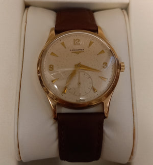 Vintage Longines watch, fully restored and fitted with new tan leather strap. Subsidiary seconds dial, manual wind mechanical movement, 9ct gold case.