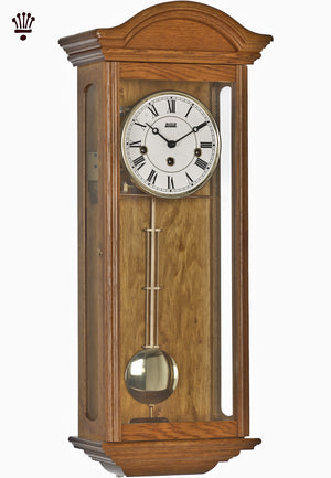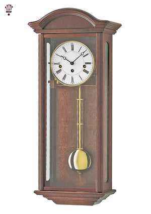 Billib wall clock 'Axford' has light oak or walnut finish, westminster chimes, key wound movement with manual night off option. Clear white dial and roman numerals.